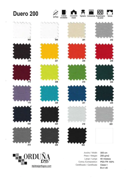 Tejido ignífugo no permanente de algodón 100 % uso exclusivo en decoración, red ferial y arquitectura efímera. Ideal para techos con sistemas de aspersión anti-incendio. Clasificación Resistencia al Fuego: CLASE 1 (UNE EN 13773:2003).